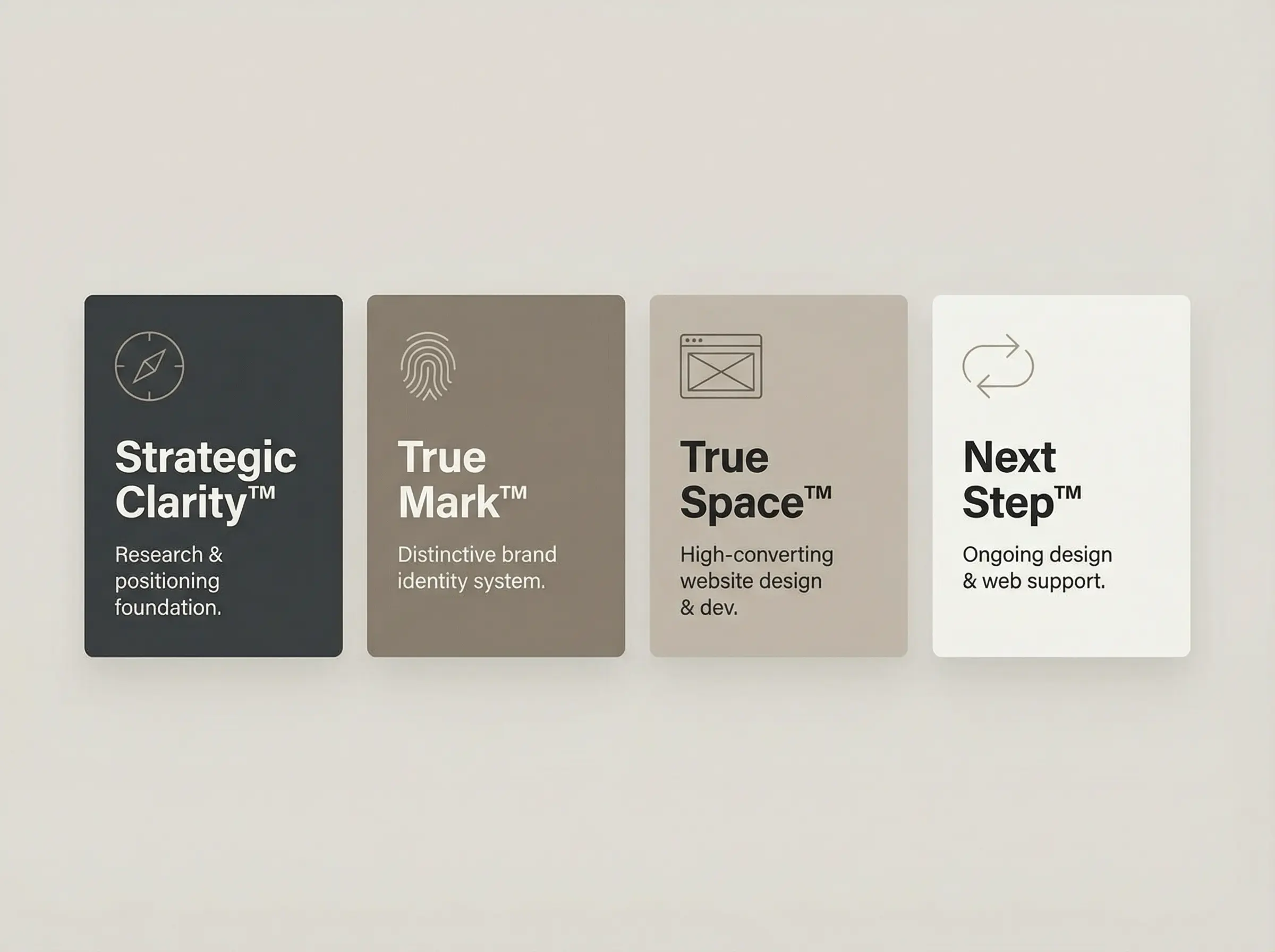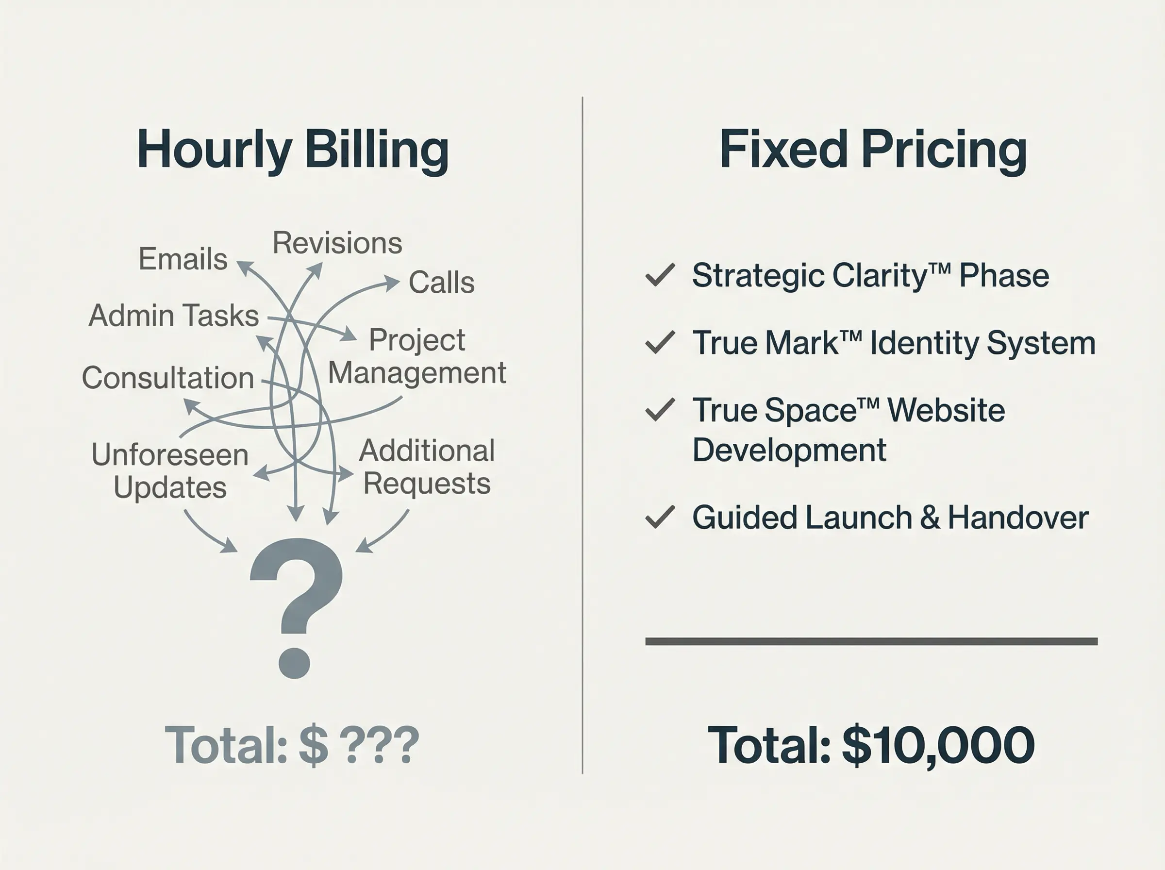 Every service we offer, Strategic Clarity™, True Mark™, True Space™, and Next Step™, has a fixed price. You see it before you commit. The scope is defined. The deliverables are listed. The number on the proposal is the number you pay.