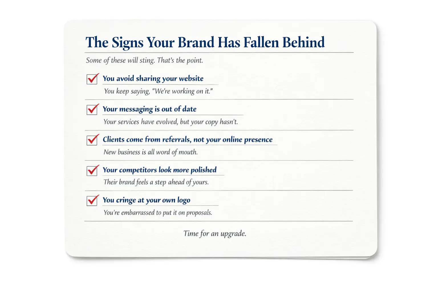 - Underpriced work. A dated brand makes it harder to justify premium pricing, even when the work itself is premium.
