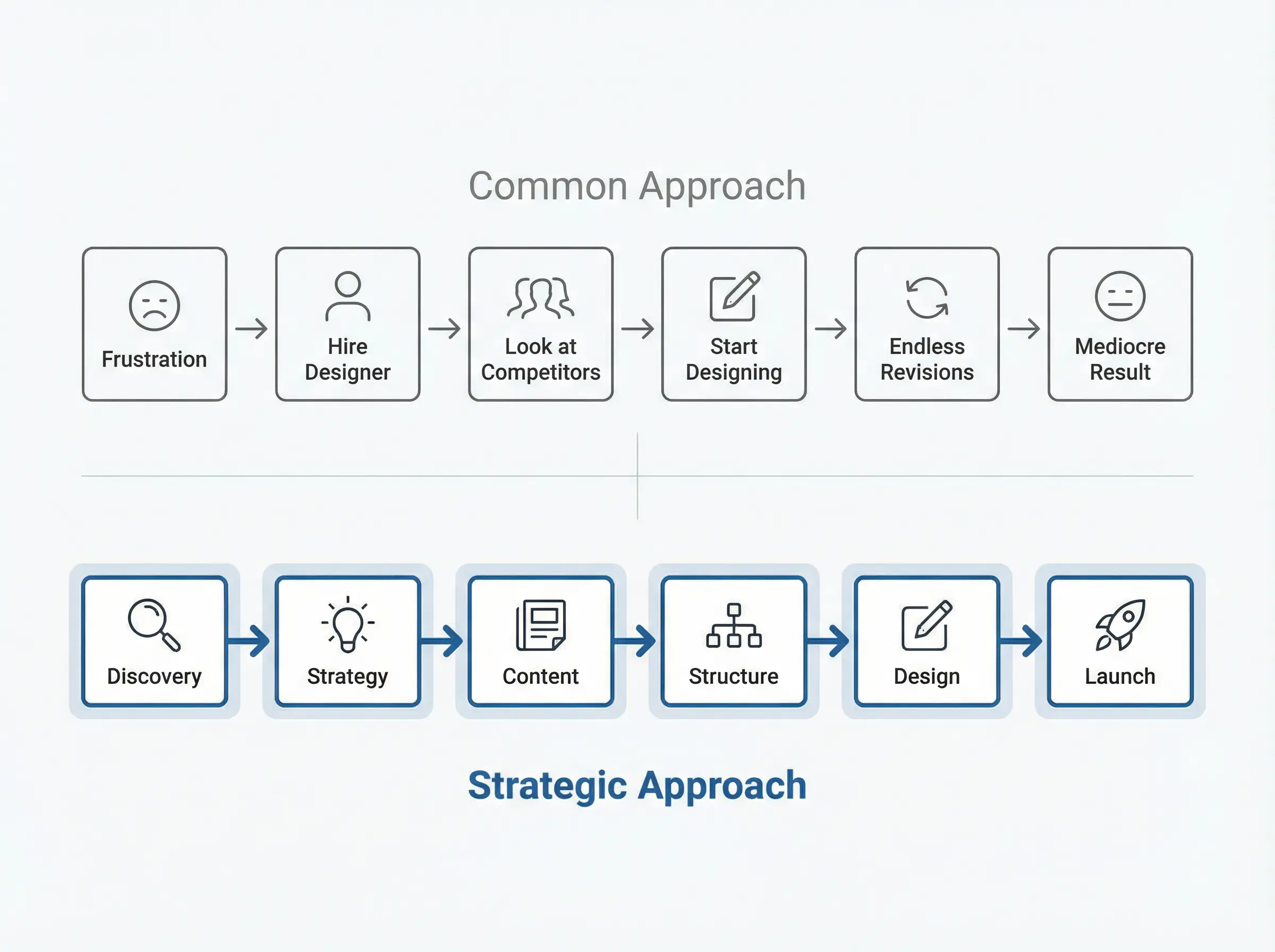 Without strategy, you'll spend those same weeks in revision cycles. You'll pay for exploration through iteration instead of through planning. The total time is often identical. But one path produces clarity and a site that works. The other produces frustration and a site that doesn't.