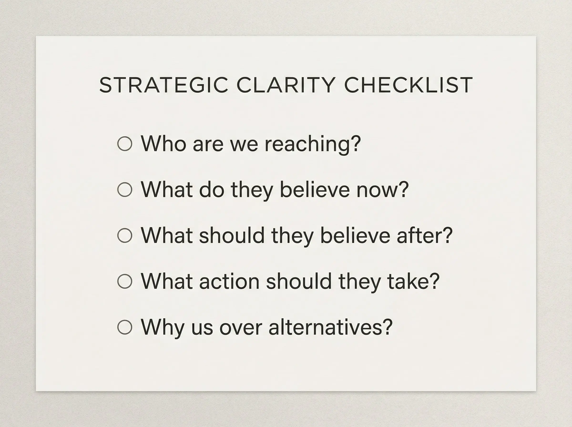 Strategic clarity means answering specific questions: Who exactly are we trying to reach? What do they believe before they find us? What do we want them to believe after? What action should they take? Why should they trust us over alternatives?